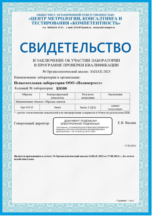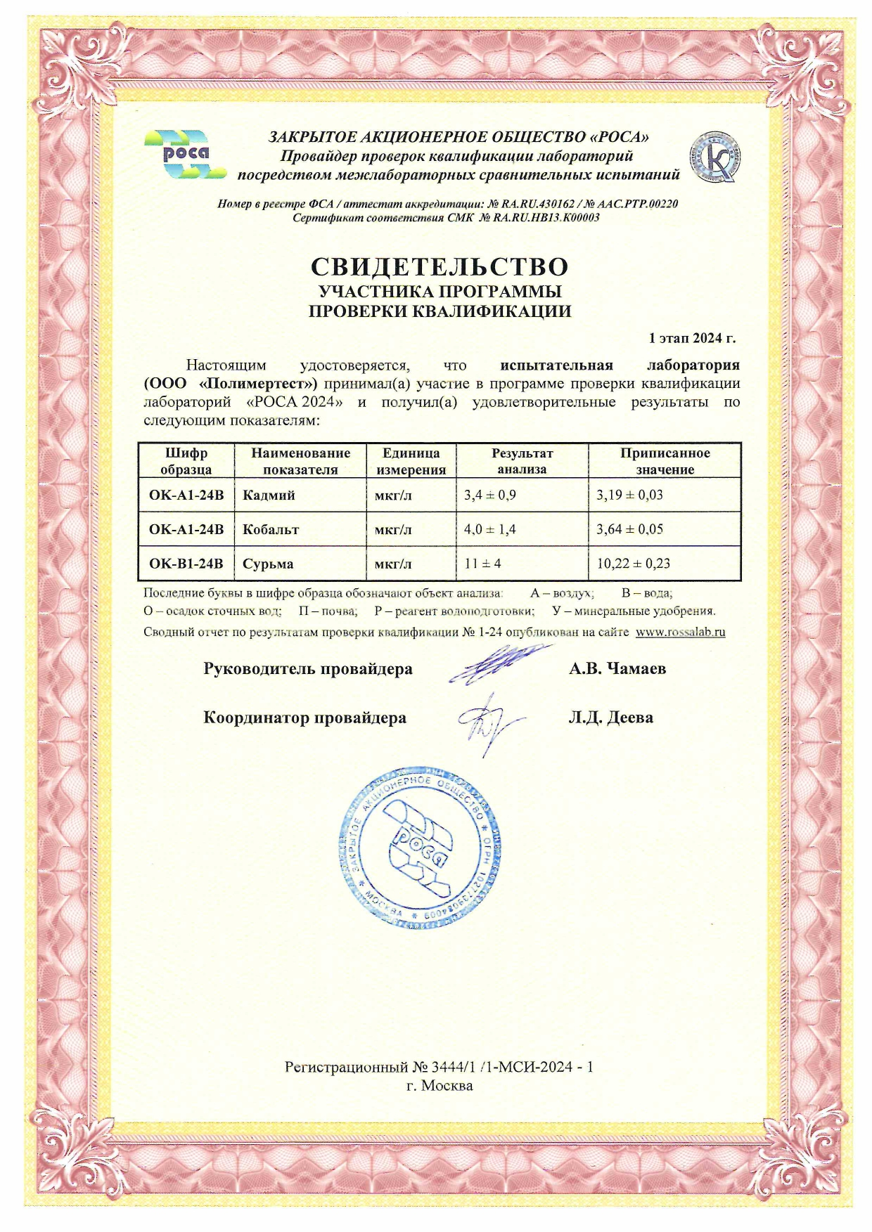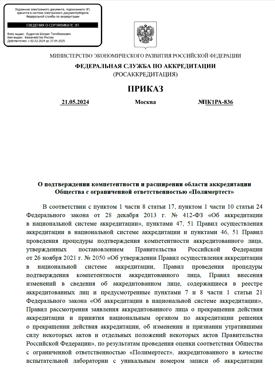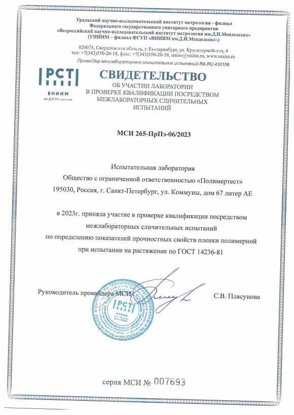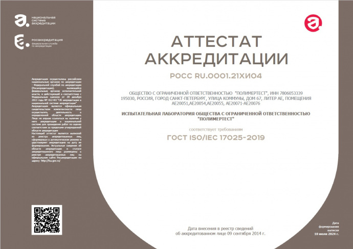 Испытательная лаборатория ООО «Полимертест» имеет уникальный номер записи в реестре аккредитованных лиц РОСС RU.0001.21ХИ04. Проверить актуальность данной информации можно на официальном сайте Россакредитации.